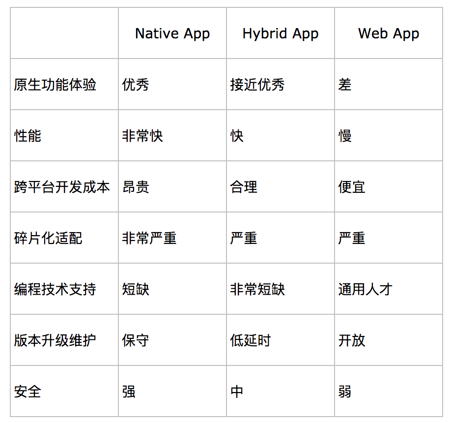 现在APP开发主要有三种方式,即,Native App、web app、Hybrid App,三种方式开发成本不一样,也各有优缺点。接下来就分别介绍三种模式的优缺点。